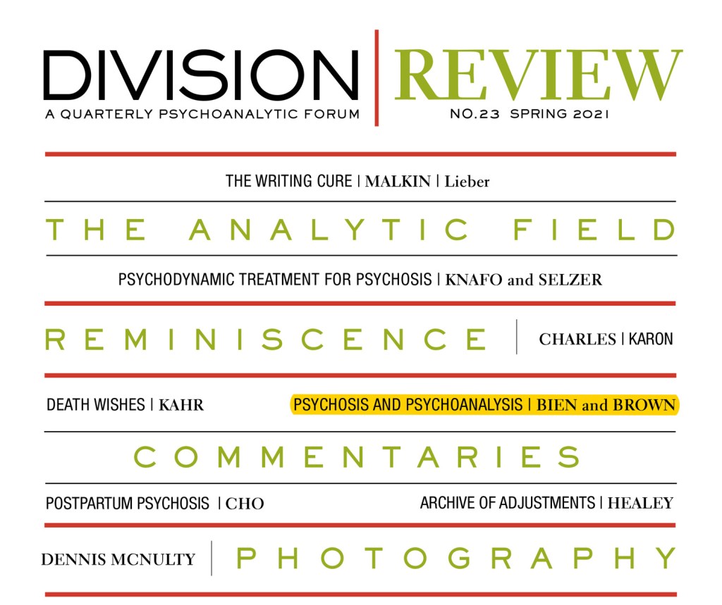 One of the joys of being mostly retired and volunteering way too much is that I have an opportunity to collaborate with amazing young people doing important and often pathbreaking work in the area of Psychosis. Psychologist Marie Brown, vice-president of ISPS-US and the person responsible for my becoming president recently held this “Dialogue” on Psychosis, Psychoanalysis, and the Peer/Survivor Movement, published in April in Division/Review, a journal of the psychoanalytical division of the American Psychological Association. The “dialogue” was in fact a laborious process on my part, entailing many hours of cogitation, writing, and rewriting to ensure that I meant what I wrote and that what wrote conveyed precisely what I wished to communicate.