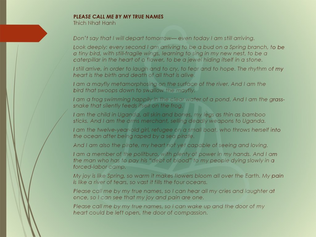 This past January, I participated in a webinar hosted by the Society for the Study of Psychiatry and Culture – with the wonderful Lauren Utter, PsyD, a Harvard-affiliated clinical psychologist who does work in early psychosis, whom I’d met when she was a Post Doc at Yale; and Dr. Francis Lu, a psychiatrist and Emeritus Professor of Psychiatry at UC-Davis. The webinar addressed self-coping and help-seeking pathways for psychosis. My portion was entitled Learning Our Voices’ True Names, inspired by Zen Master, spiritual leader, poet, and peace activist Thich Nhat Hanh’s poem, Please Call Me By My True Names, which captures poignantly and evocatively the beauty, pain, and terror of the human condition—of living and being in the world. Each of us embodies, to some degree, each of the life forms he describes. Each of us has within us that which is innocent, true, and beautiful. And each of us has within us that which can render us the hapless victim, or the predator, or, if we are unlucky, and not careful, the arms merchant, and the sea pirate.