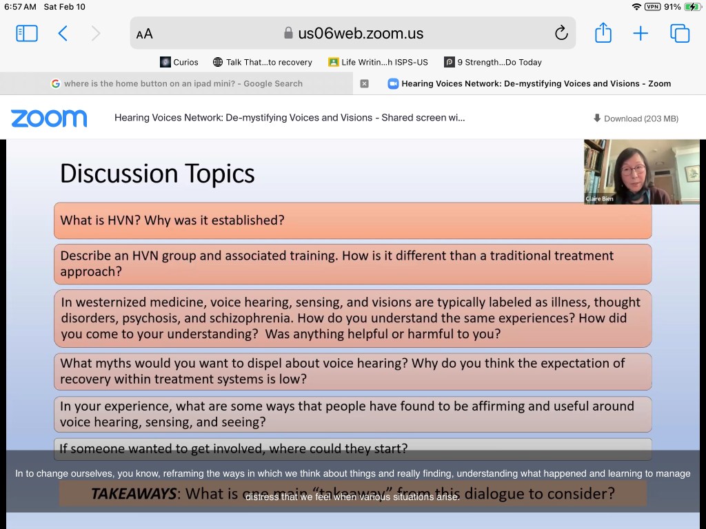 Claire Bien: One of the questions [in the chat] that I saw was about the empathic experience– being an empath. And I learned that term only in 2017, when Dr. Ken Blatt told me I am an empath. And I began doing some reading. And now I understand so much that I didn’t understand about myself, what was going on. Why I sometimes felt as if I had no personality of my own. Why sometimes I could barely speak when I met someone, because the energy was wrong, but I didn’t know that. And so I spent most of my life trying to make sense of those feelings and experiences and feeling different and just kind of overwhelmed. And now it all makes sense. On the continuum of voice-hearers, I am now understanding that my experiences are mostly spiritual, familial, all of those things. But there are so many different understandings in a lot of the work that I’m doing through Yale PRCH and through the International Society for Psychological and Social Approaches to Psychosis (ISPS). And especially through HVN, being curious about my own experiences and trying to encourage other people to be curious about theirs. And knowing that, especially for those of us who are empathic, and also sometimes when the voices begin, it seems similar to a form of PTSD, and it’s not permanent, if we just wait instead of going. I have found that if I don’t go in that direction and follow the voice and worry, then I could bring myself back, I could calm myself back down. And the voices are not so difficult–or the experiences, not so terrifying.